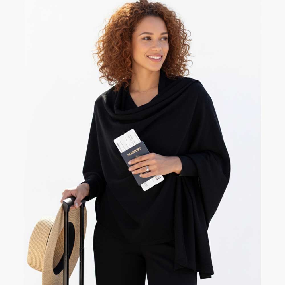 3. SEO Optimized Description: Experience the perfect blend of elegance and utility with our Black Cashmere Blend Travel Wrap. This sophisticated shawl is designed for the modern traveler, offering a layer of cozy warmth without the bulk. Whether you are navigating a breezy airport terminal or attending a formal outdoor event, the deep black hue provides a timeless look that matches every outfit. Its soft, knit texture feels gentle against the skin, making it an ideal companion for long-haul flights or cool autumn evenings. Compact enough to fold into your handbag yet large enough to use as a protective wrap, this shawl is the ultimate accessory for style-conscious women.